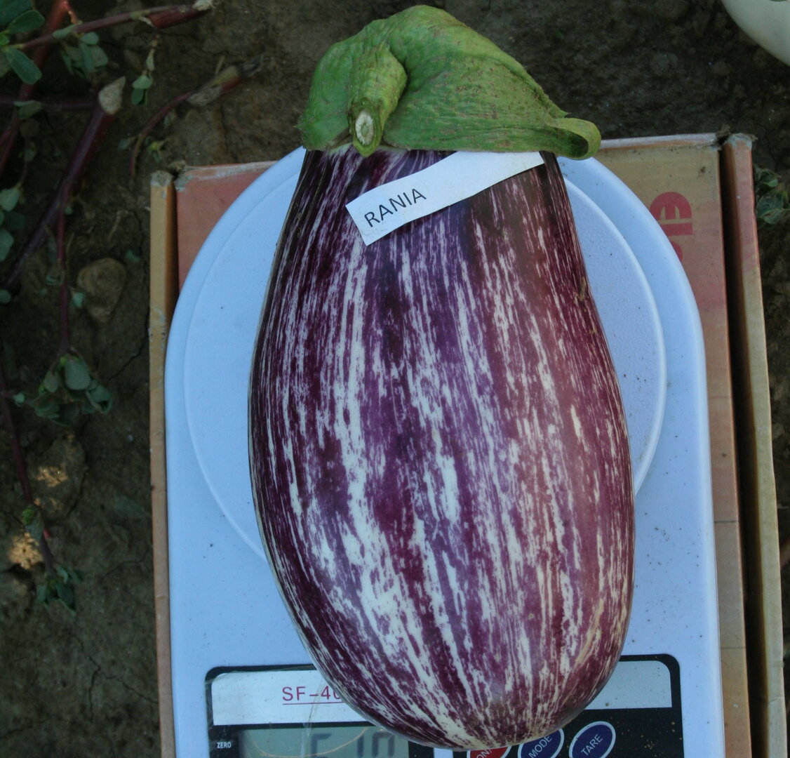 Plodovi su ovalnog oblika, dužine 20cm, obima 32cm, težine oko 520g. Boja kože je tamnoljubičasta sa belim prugama.
