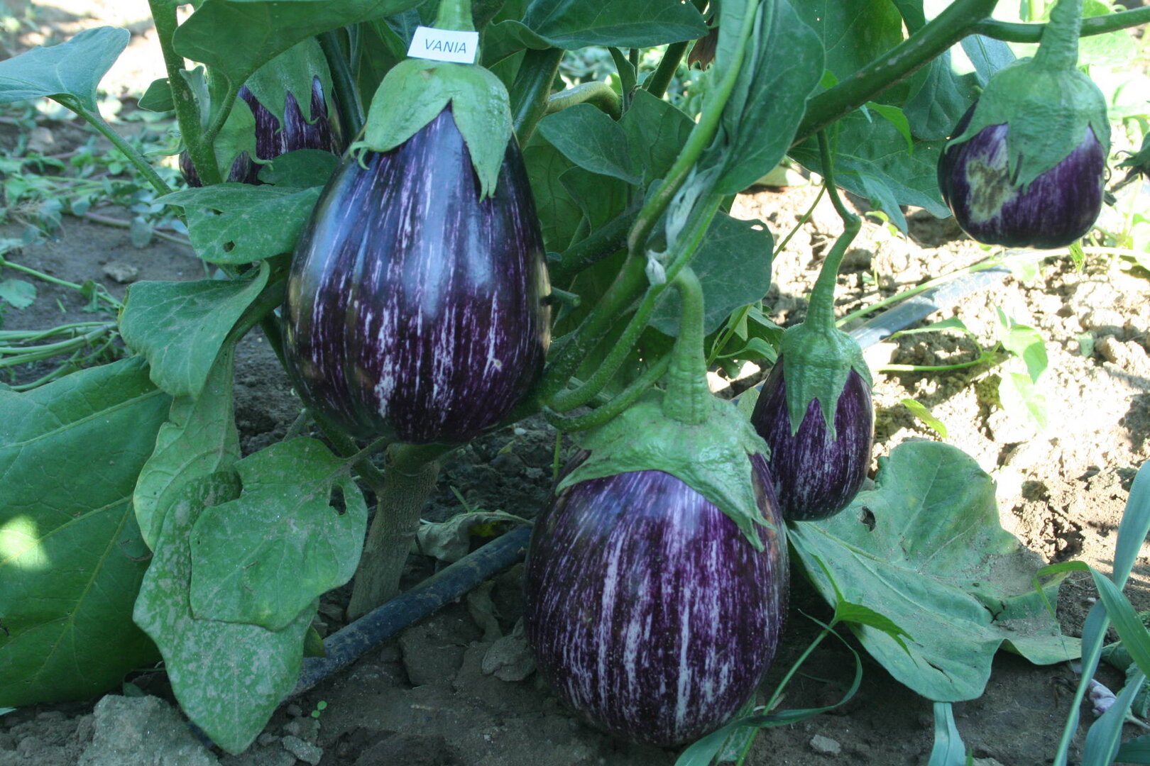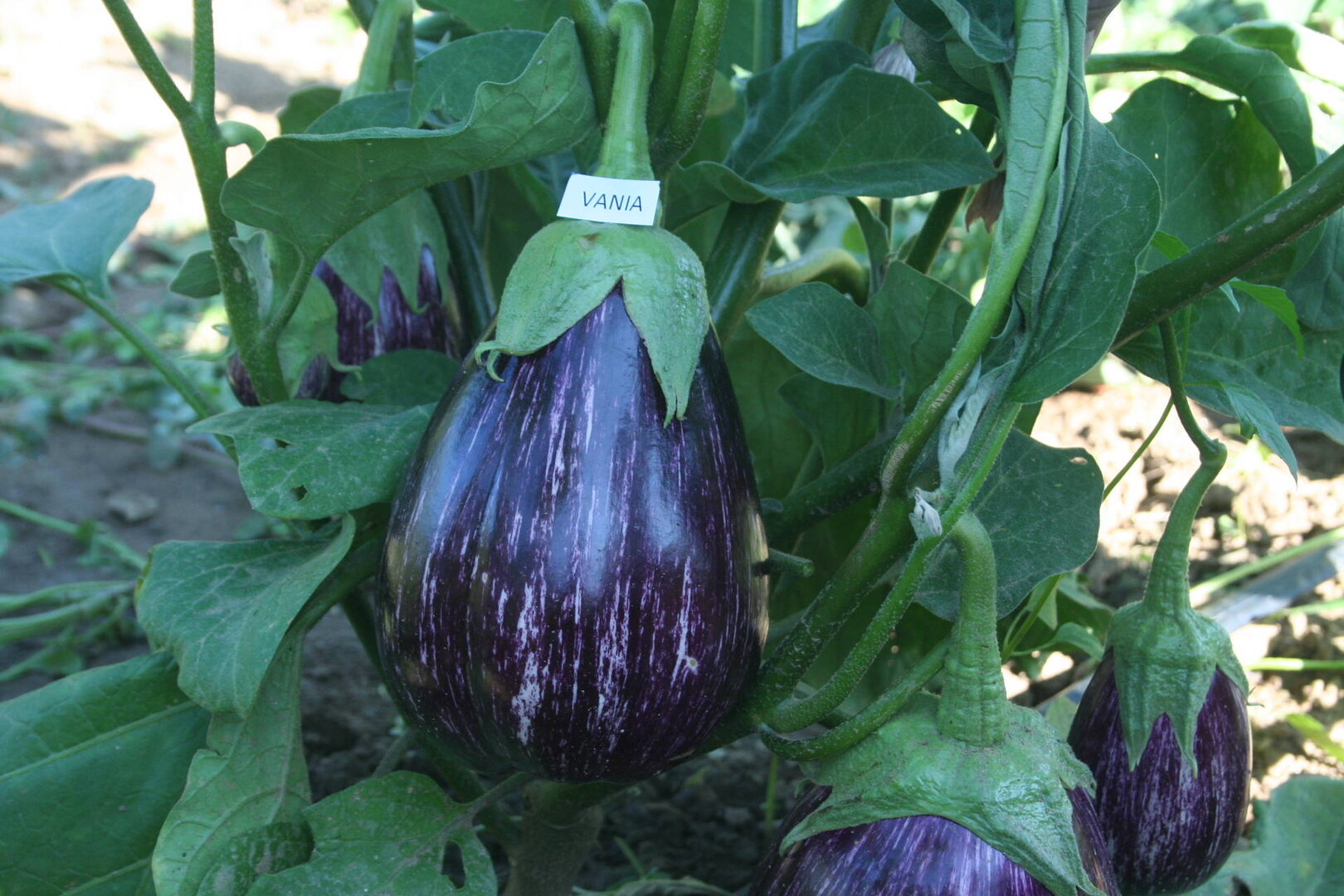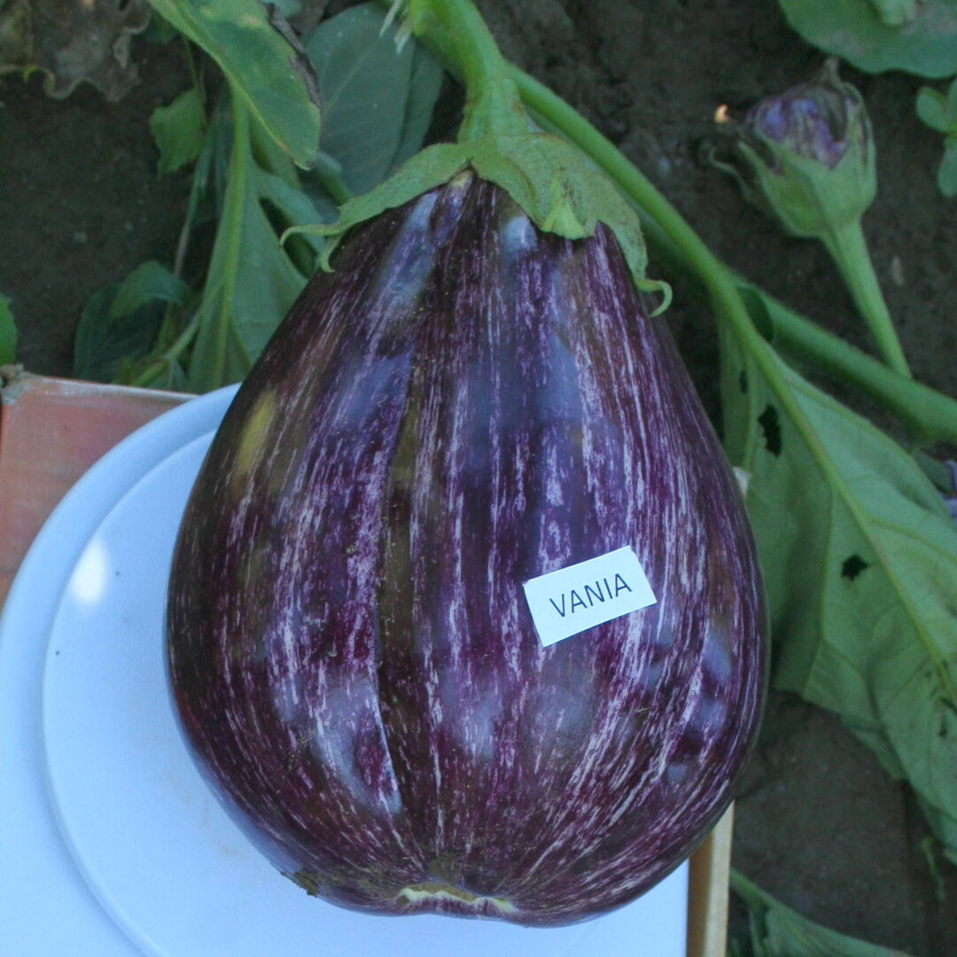 Vania F1 – Rani hibrid, okruglo-ovalnog oblika, svetloljubičaste boje sa belim linijama.